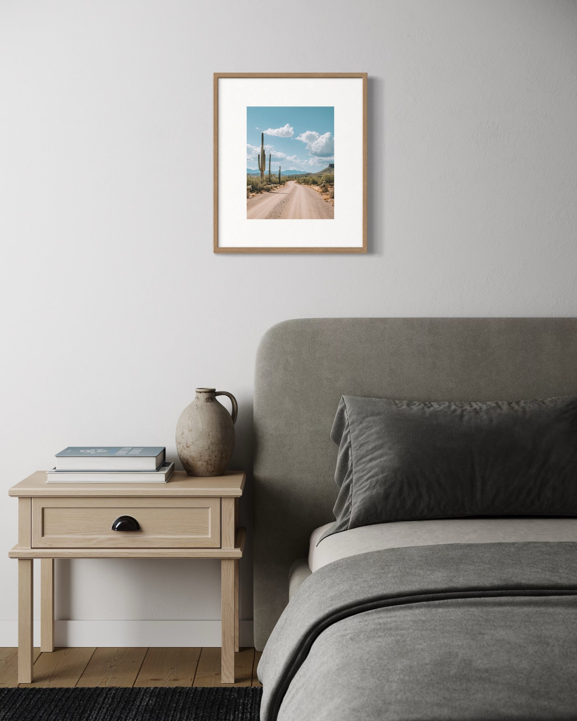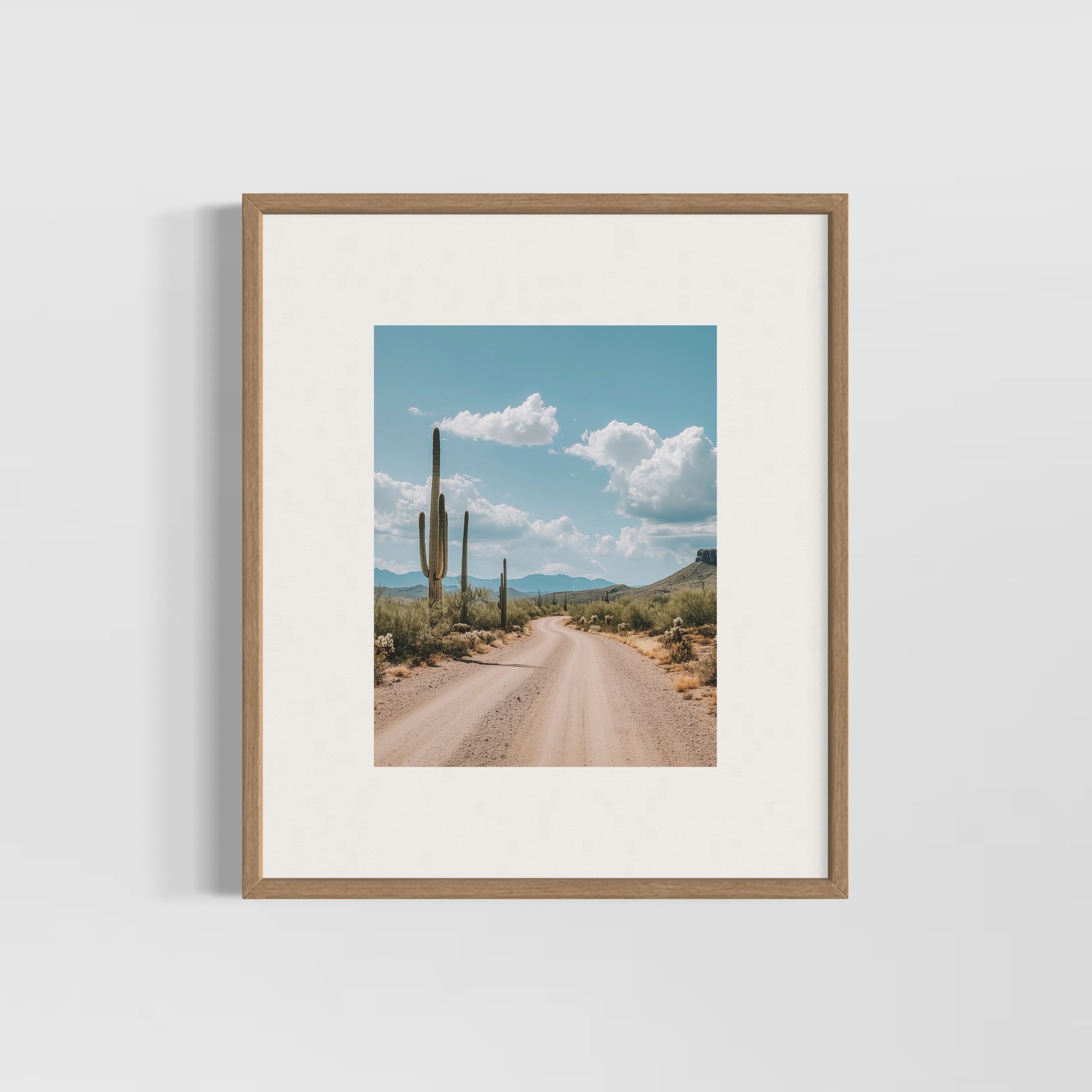 Impreso en papel del algodón duro. Esta fotografía enmarcada captura la esencia del paisaje desértico con una composición serena y evocadora. La perspectiva invita al espectador a recorrer visualmente el sendero, transmitiendo una sensación de profundidad y exploración.