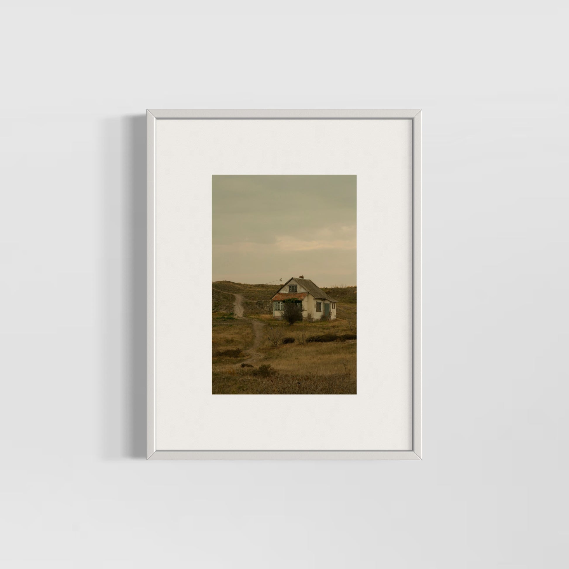 Impreso en papel del algodón suave. Esta fotografía muestra una casa solitaria en medio de un paisaje natural con tonos terrosos y cielos nublados, transmitiendo una sensación de calma, nostalgia y aislamiento.