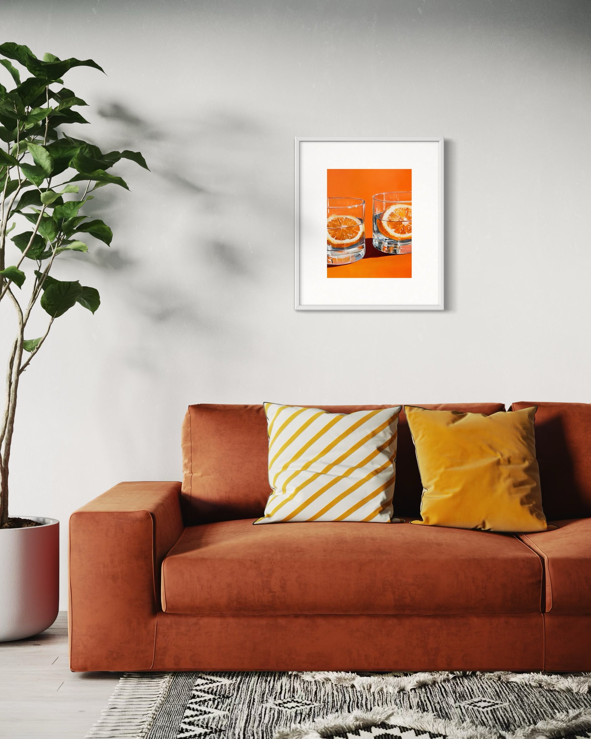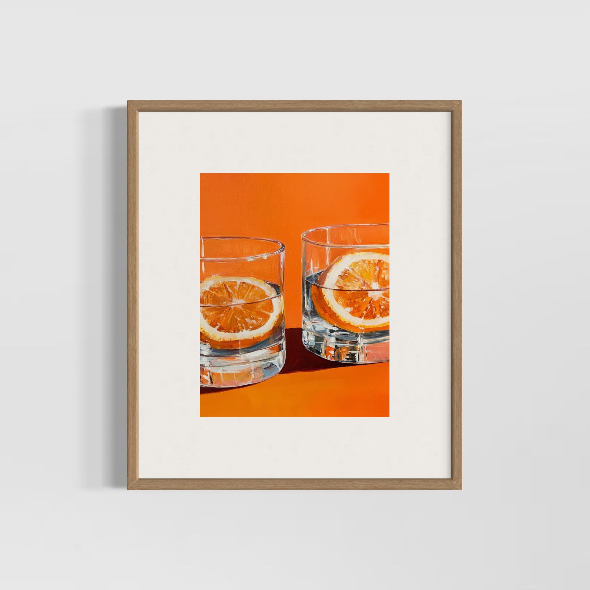 Impreso en papel del algodón suave. Esta obra despierta los sentidos: refresca, estimula, invita a saborear. Logra esto solo con imagen, lo cual es un mérito visual poderoso. El uso del naranja transmite energía, creatividad y alegría. Es un color asociado con el verano, la vitalidad y el optimismo.