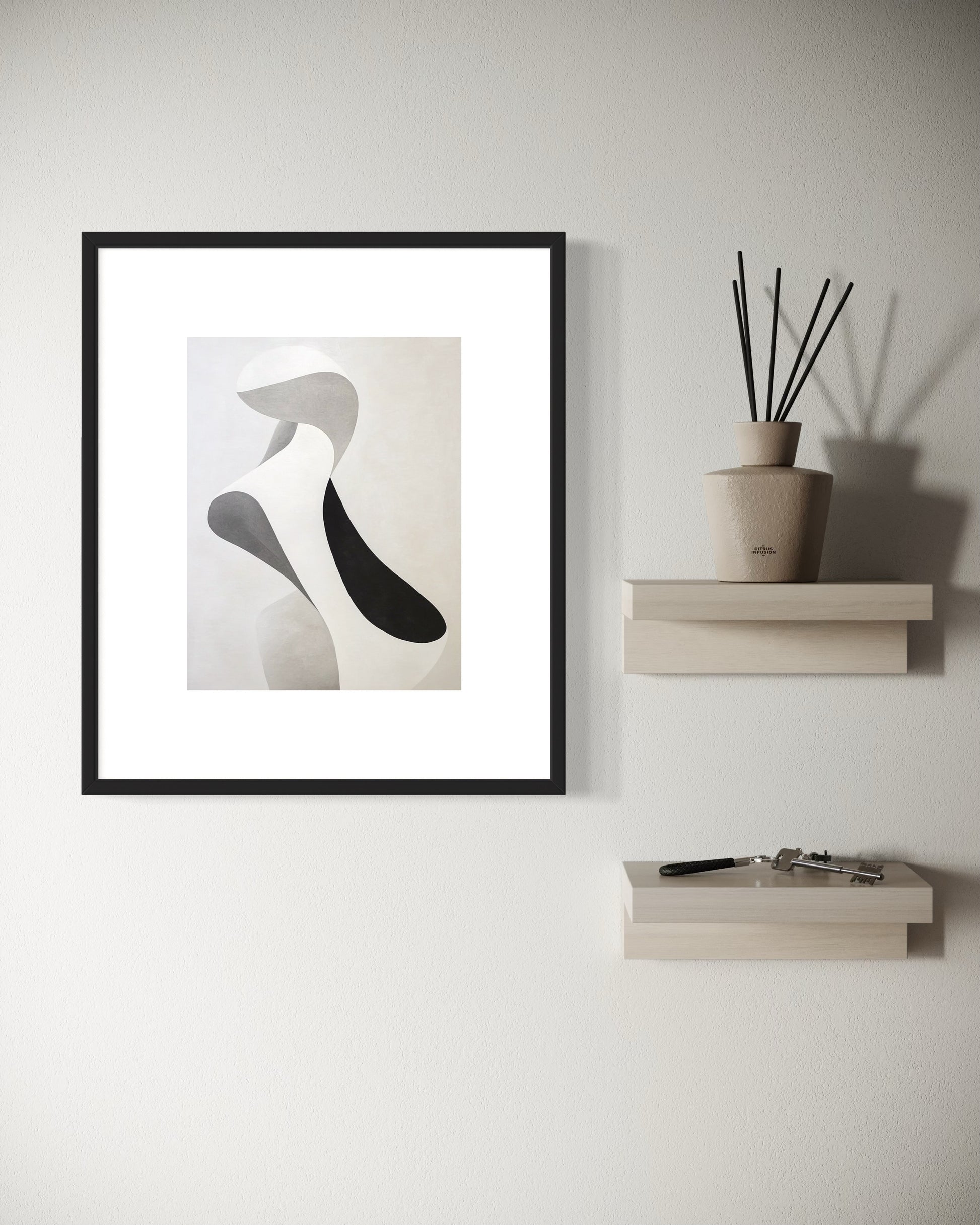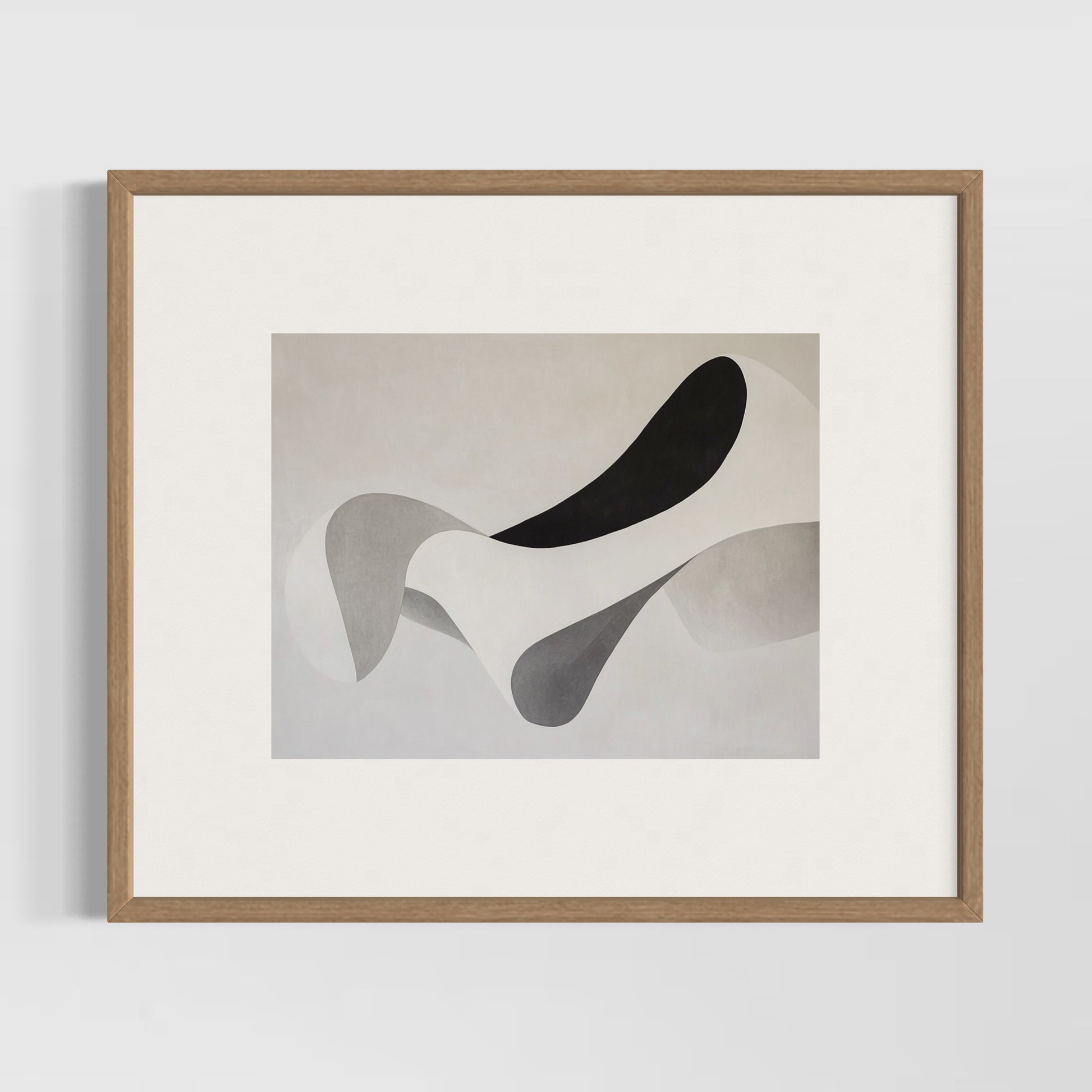 Impreso en papel del algodón suave. En este diseño las figuras fluyen con suavidad, como si fueran sombras en movimiento o manchas de tinta esparciéndose sobre la superficie. La imagen transmite una atmósfera sofisticada, moderna y serena.