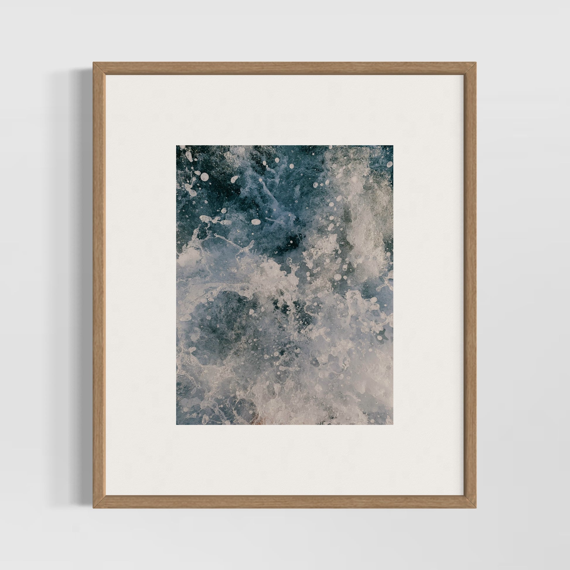 Impreso en papel del algodón suave. Esta imagen que captura el instante preciso en que una gota impacta y se convierte en un splash de agua en tonos de azul. Las formas se expanden en múltiples direcciones, con líneas dinámicas y curvas fluidas que transmiten movimiento y energía.