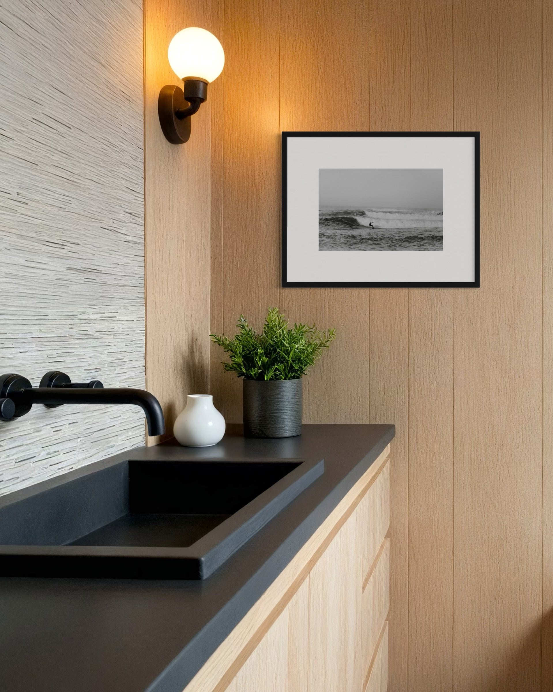 Impreso en papel del algodón suave, este enmarcado fotográfico es un detalle perfecto para espacios modernos y amantes del las olas.